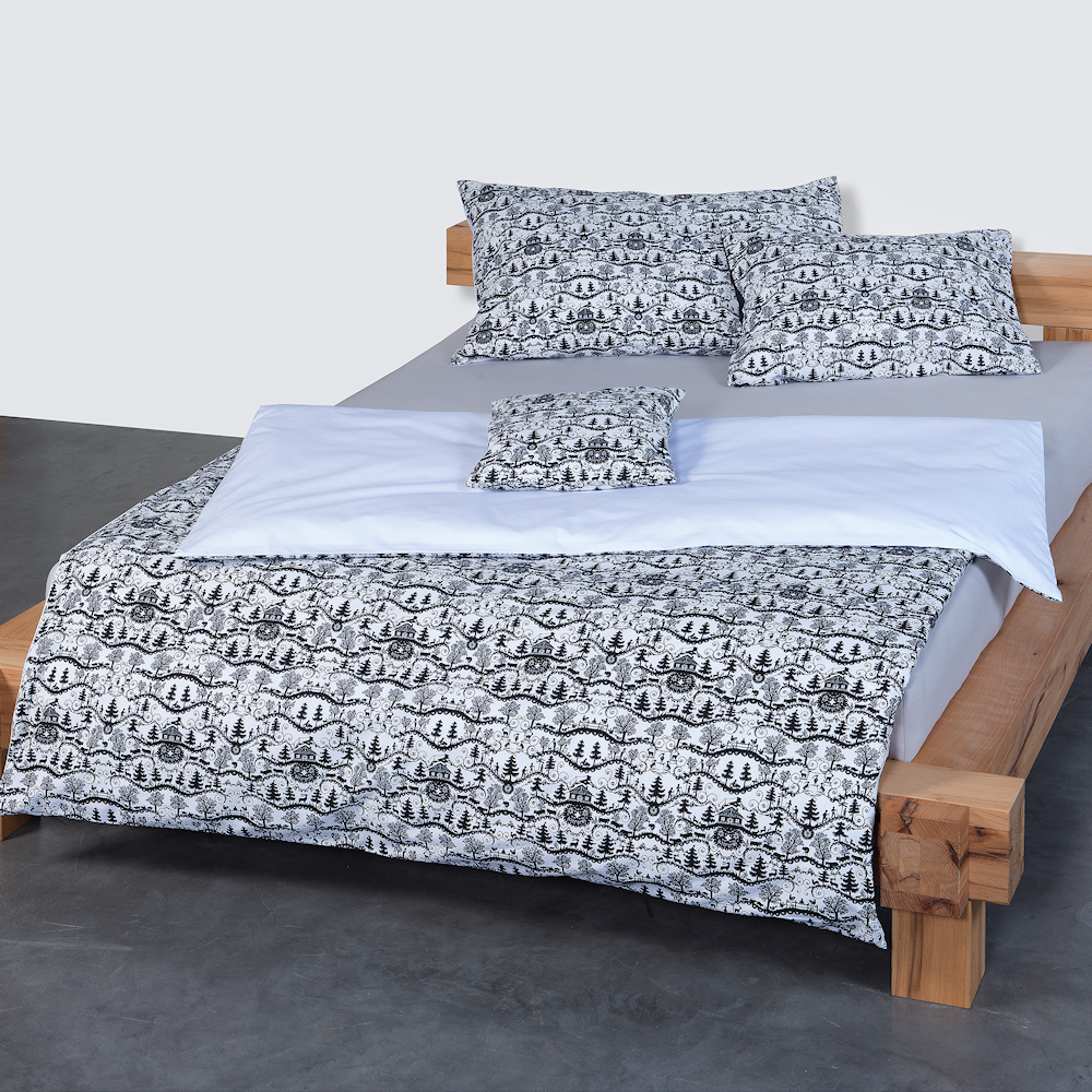 Trend Markenbettwäsche Kultschtoff: SCHEREREI (entworfen von der Schweizer Künstlerin Jolanda Brändle) Exklusiver Alpen-Look Landhaus Bettwäsche Schwarz/Weiss, aus hochwertigen Baumwollgarnen. Der moderne und urgemütliche Alpenchic lässt sich in jedem Raum in der Wohnung- und Chalet umsetzen. Die positiven Eigenschaften von 100% Naturfasern wie Feuchtigkeitsaufnahme, Strapazierfähigkeit und Pflegeleichtigkeit wird unterstützt mit einer ausgewogenen Hochveredelung.